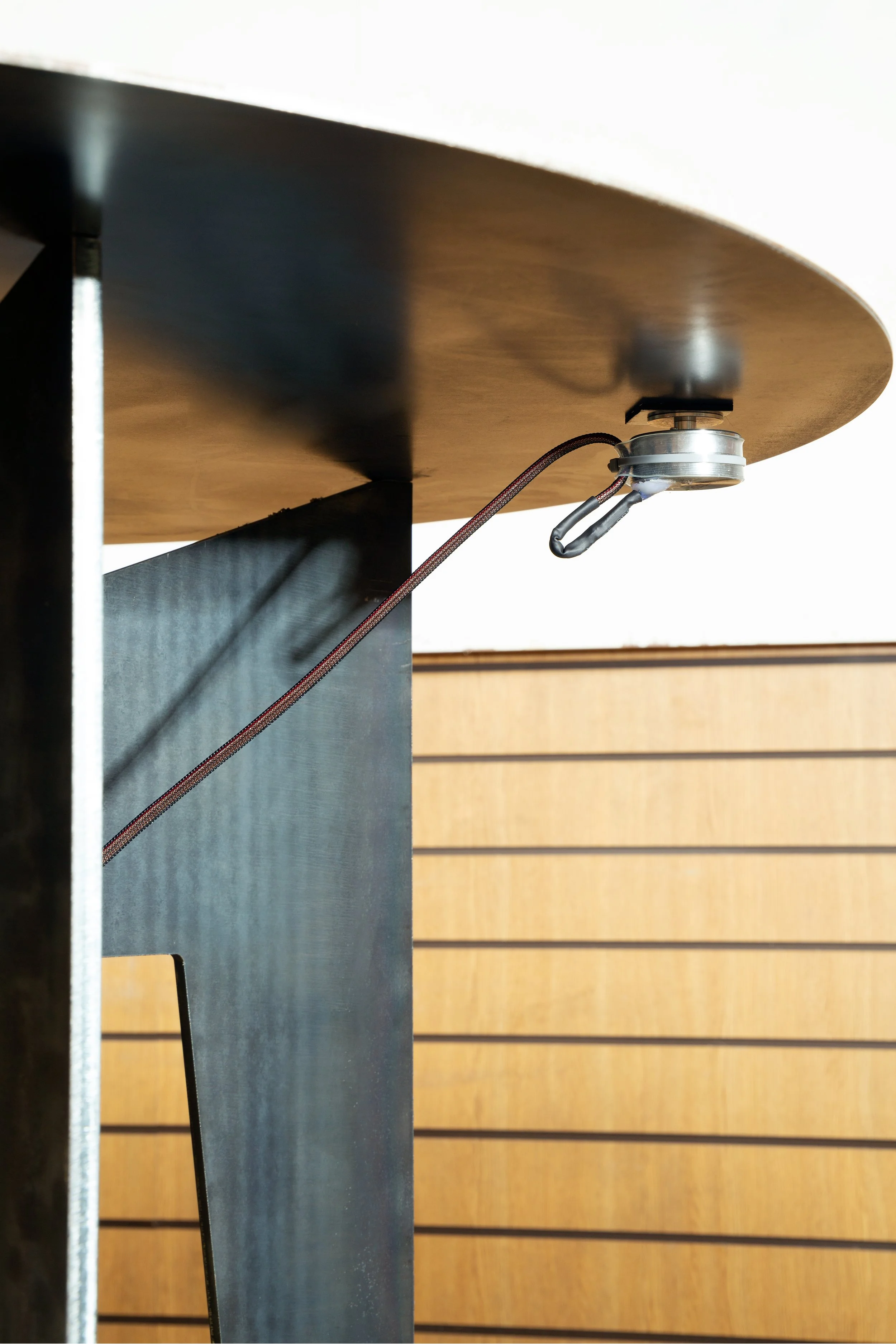 The steel sculpture, which mediates the voices of the interviewees, resembles a round table, reflecting the conversational setting where most discussions took place—often at the participants' kitchen tables. This design conveys the intention to bring the voices together in a domestic setting, while also acknowledging that these conversations rarely enter the public realm on equal terms.